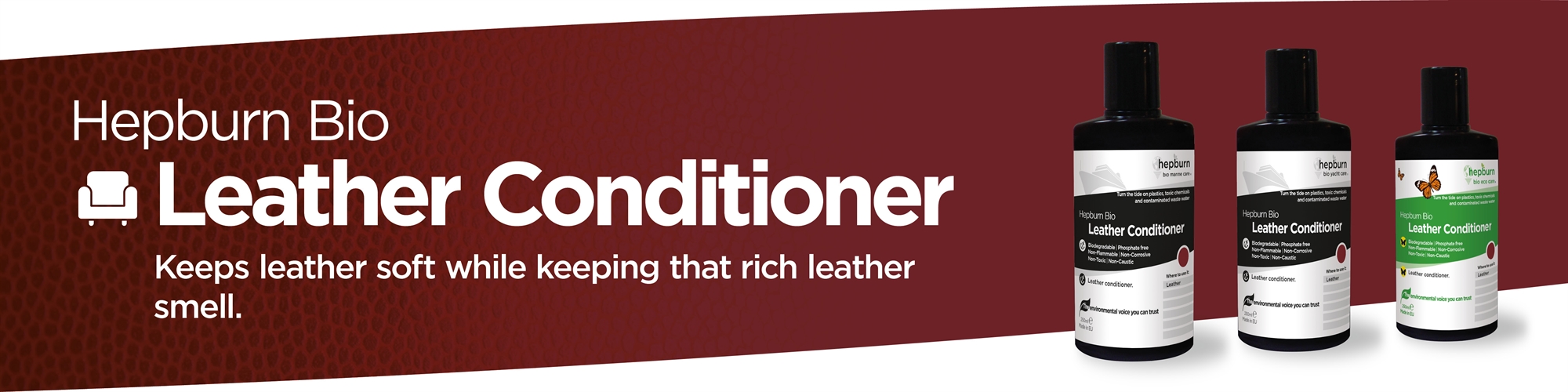 Hepburn Bio Leather Conditioner provides a protective coating against dirt and stains for all leather types and interiors, furniture and upholstery. It also restores the leather’s original finish whilst softening leather and restoring that rich leather smell.