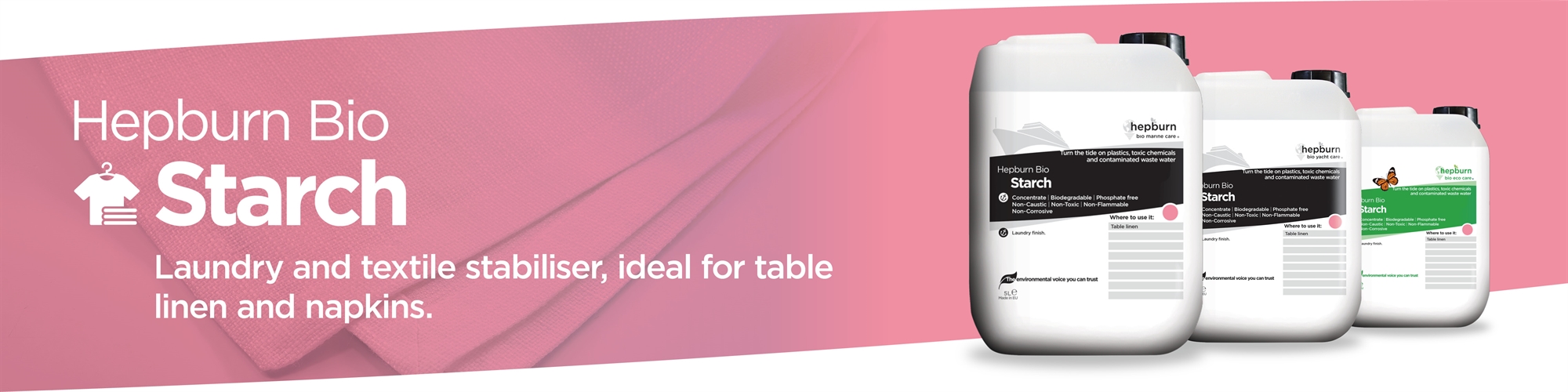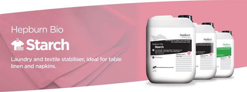 Hepburn Bio Starch is a laundry and textile stabiliser with effective emulsion in water. It gives a suitable finish to table linen and napkins, making them feel as stiff as required. Bio Starch is easily dispersible with a homogeneous effect, works at low temperatures, has a long-life stable emulsion, and is biodegradable, Due to its lasting effect, Bio Starch is an economic product and can be added in one out of every two or three washes.